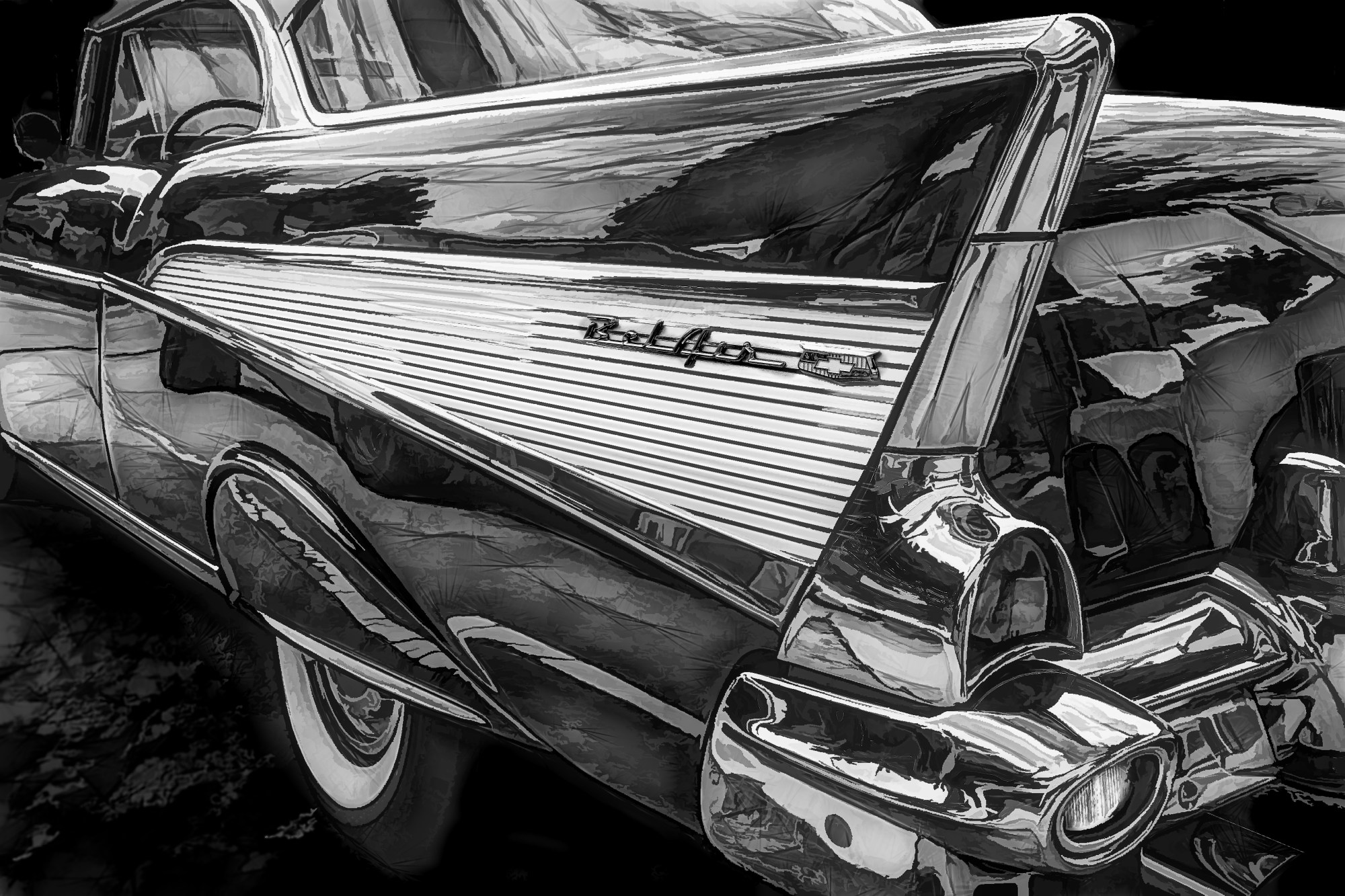 Another photograph of Allan’s is titled, ‘Bel Air,’ and was published in Journey’s last anthology, Masks, Facades, and Reveals. It illustrates my short story, Death Comes a Courting. The main character of my supernatural tale is Ramiel ‘Rami’ Azrael. He is the Angel of Death–a very cool dude who sings Rolling Stones songs, like ‘Hey, You, Get Off of My Cloud, and drives the classic ‘winged’ sedan–the 1959 Chevy Bel Air!