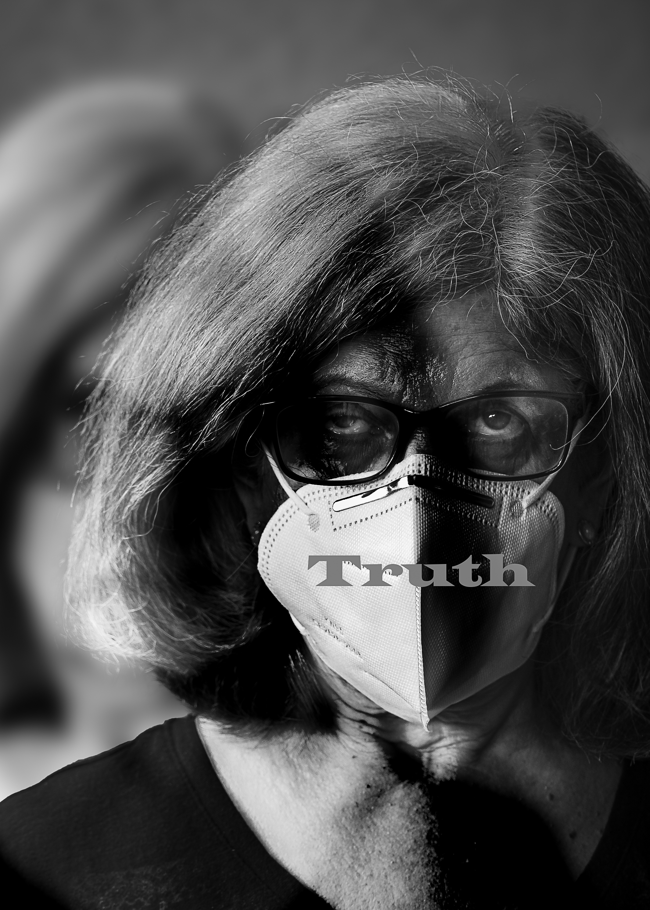 Allan created this photograph by taking two photographs–a woman wearing a mask and not wearing a mask (I was his model)–and then combining them in Photoshop to create the final image. He also used dodging and burning—photographic techniques especially used in black and white photography—to give the image a dynamic, dramatic effect.